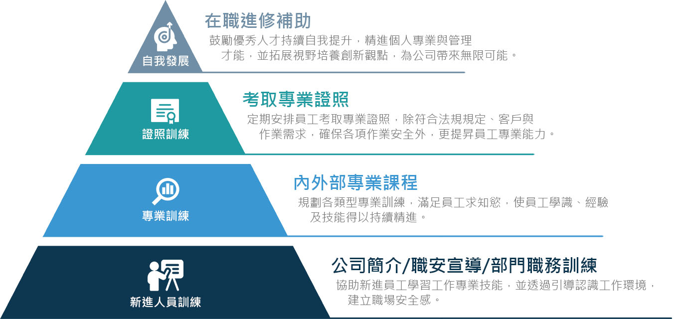 信紘集團深信企業成長源於人才的持續精進,為提升同仁專業能力並培育各職務之適任人選,每年依據組織發展需求與員工職務性質,整合公司內外部資源,規劃並執行年度教育訓練計畫。教育訓練區分為「新進培育、專業能力、證照發展及管理人才培訓」等訓練類別,透過系統化之職涯能力培訓與學習課程,培養專業人才並拔擢具潛力之管理人才,以支持集團永續發展。