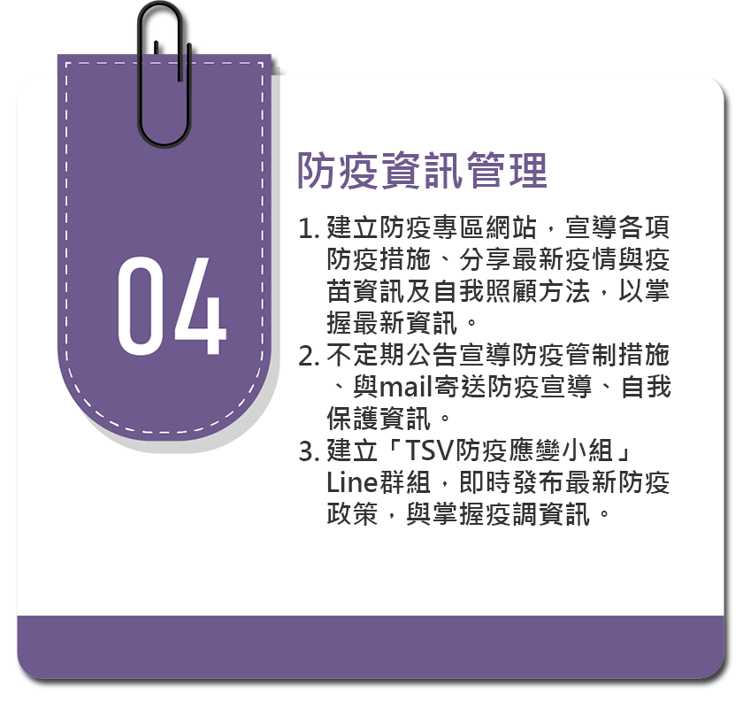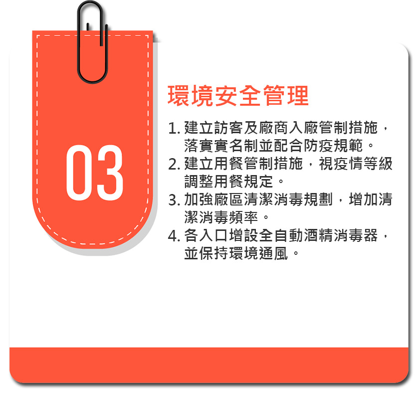 新冠肺炎蔓延全球,台灣疫情亦無法鬆懈,為降低同仁染疫風險及避免疫情嚴重影響公司營運,進而成立防疫應變小組,制訂應變策略及各項預防方案與措施,使同仁在安全無慮的環境下工作。